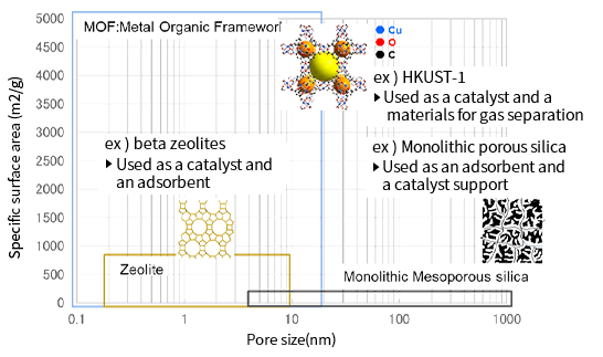 We have developed porous materials with unique properties such as mesoporous materials, zeolite, and MOF for various applications