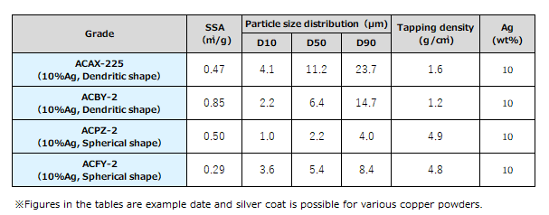 - Using advansed technology and accumulated know-how, we developed high performance Ag coated Cu powders. We could offer powders that meet the required properties such as dispersity, shape and conductivity